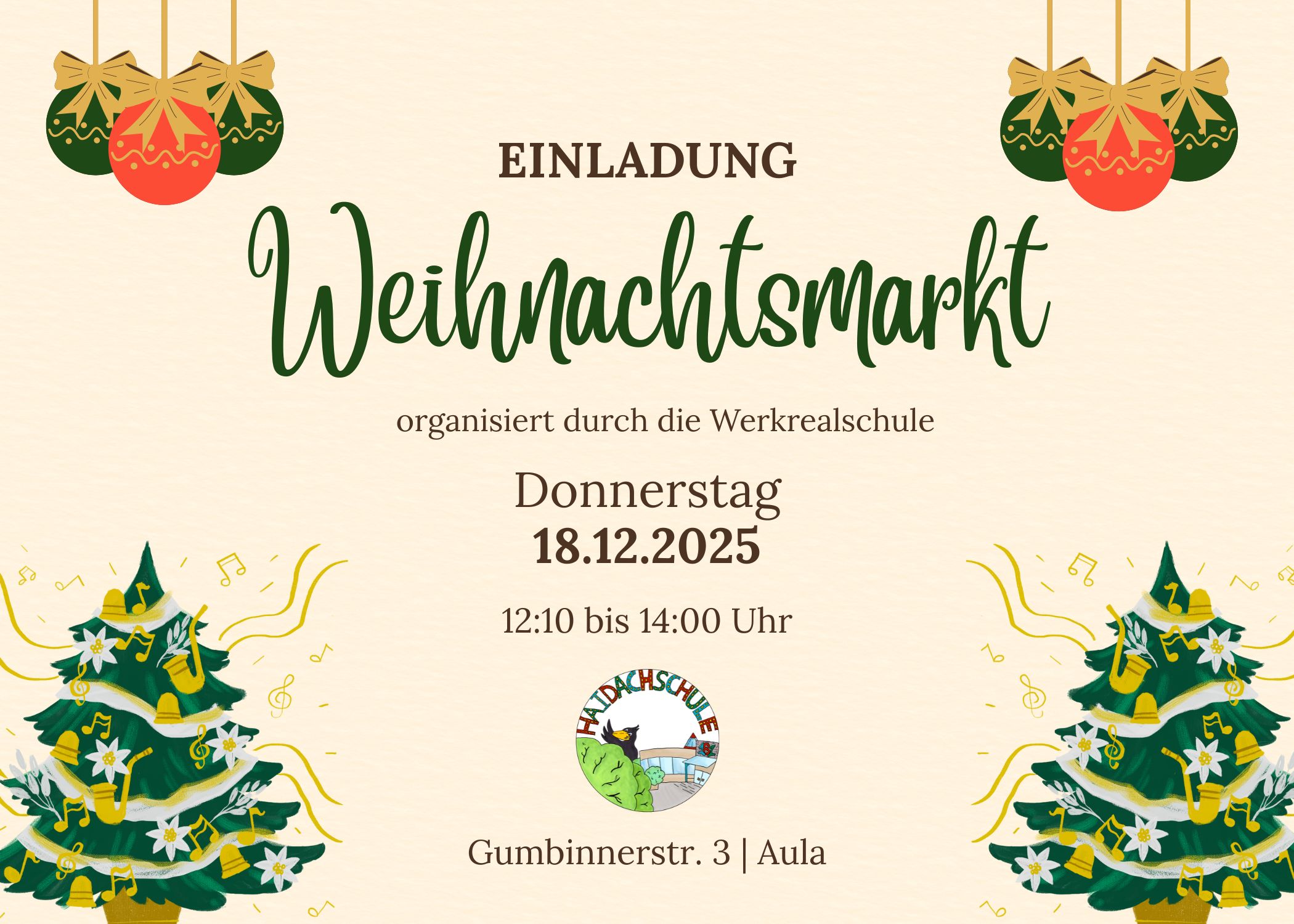 Auch dieses Jahr laden wir Sie und Ihre Familie ein, unseren alljährlichen Weihnachtsmarkt zu besuchen. Dieser wird wie jedes Jahr von den Schülerinnen und Schülern der Werkrealschule organisiert und bietet zahlreiche Stände mit unterschiedlichen Angeboten. Diese reichen von leckeren deftigen oder süßen Speisen über toll gestaltete Weihnachtskarten bis hin zu liebevoll angefertigter Dekoration.